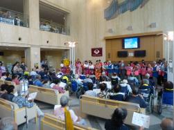 「さくらまつり」にちなんで春の歌を中心に演奏し、また会場のみなさんと一緒に歌を歌ったり踊ったりすることができ、市民病院に一足早く桜がさいたような明るい雰囲気になりました。